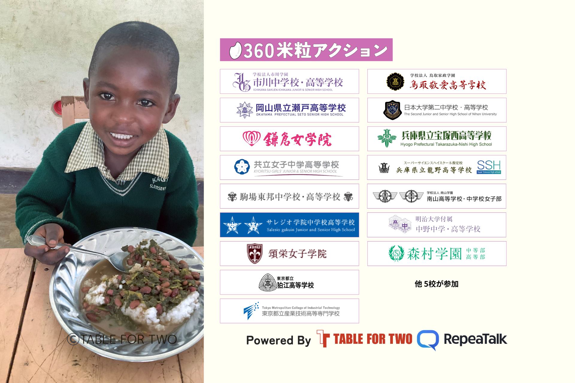 ※2)米粒数は「1食分相当のカロリーメタファー」として設定。寄付される給食はTABLE FOR TWO Internationalを通じ、各地域の栄養ニーズに応じた温かい食事として提供されます。
